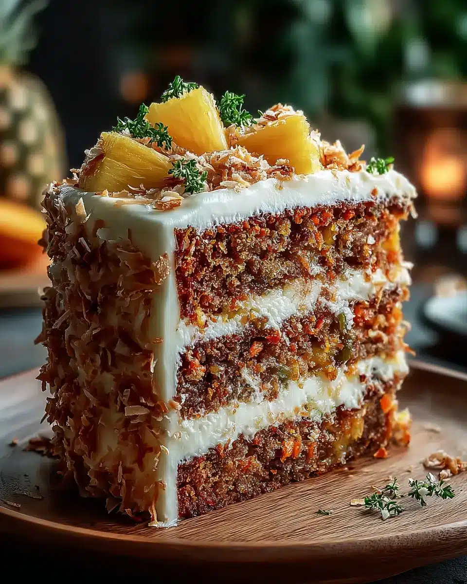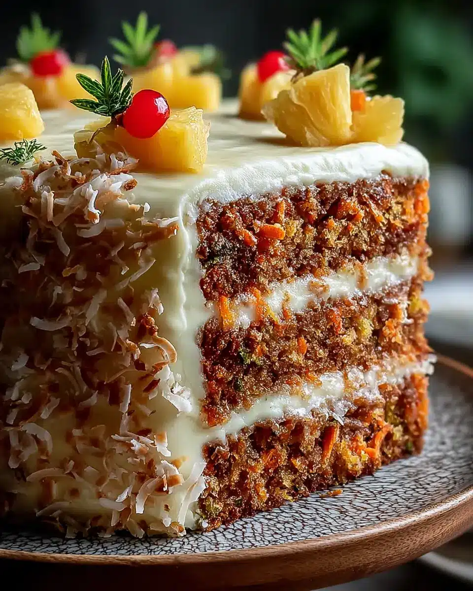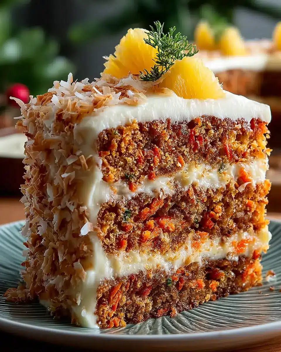 What makes this cake stand out? First off, its incredibly moist texture and rich flavor profile. The combination of sweet, grated carrots and crushed pineapple creates a perfect balance, while the hint of coconut adds an exotic twist. It’s like a holiday getaway on your plate!