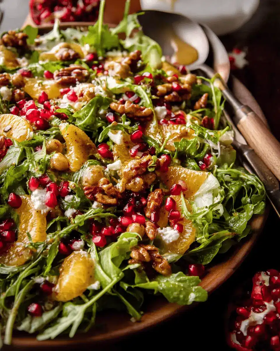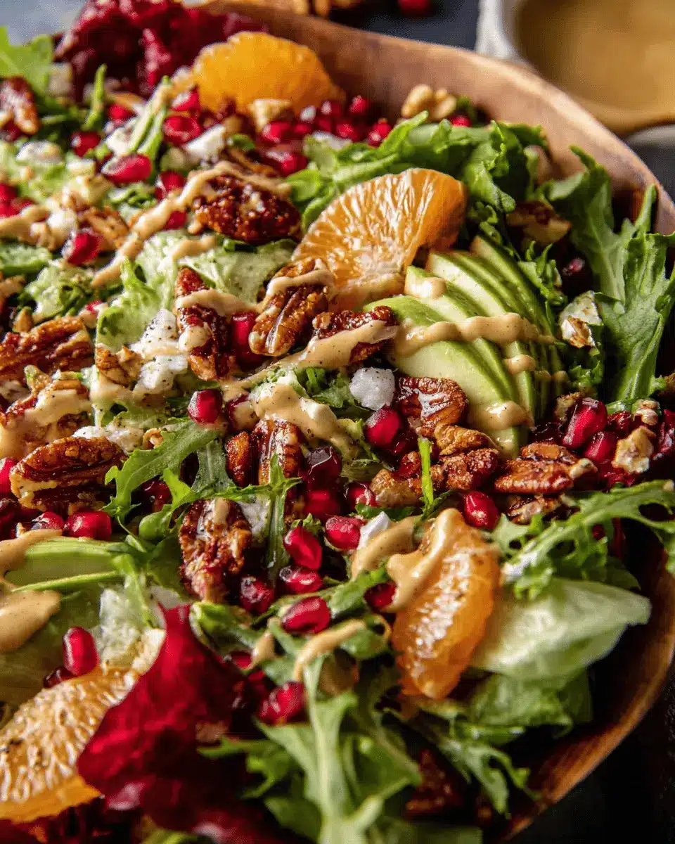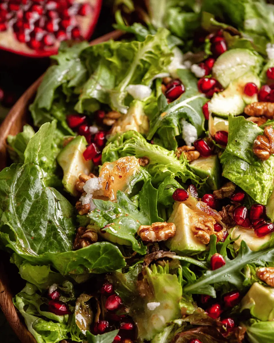 Imagine a vibrant mix of fresh greens, creamy avocados, crunchy walnuts, and tangy pomegranate arils, all topped with a luscious honey mustard dressing. This salad is the epitome of seasonal eating, intertwining health and indulgence in a single bowl.