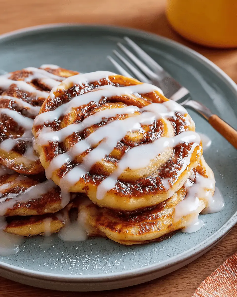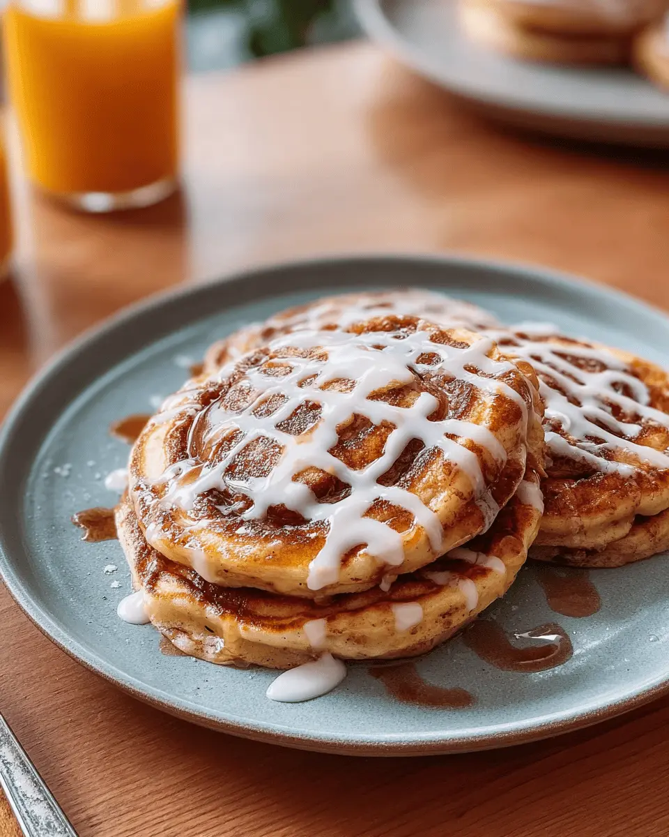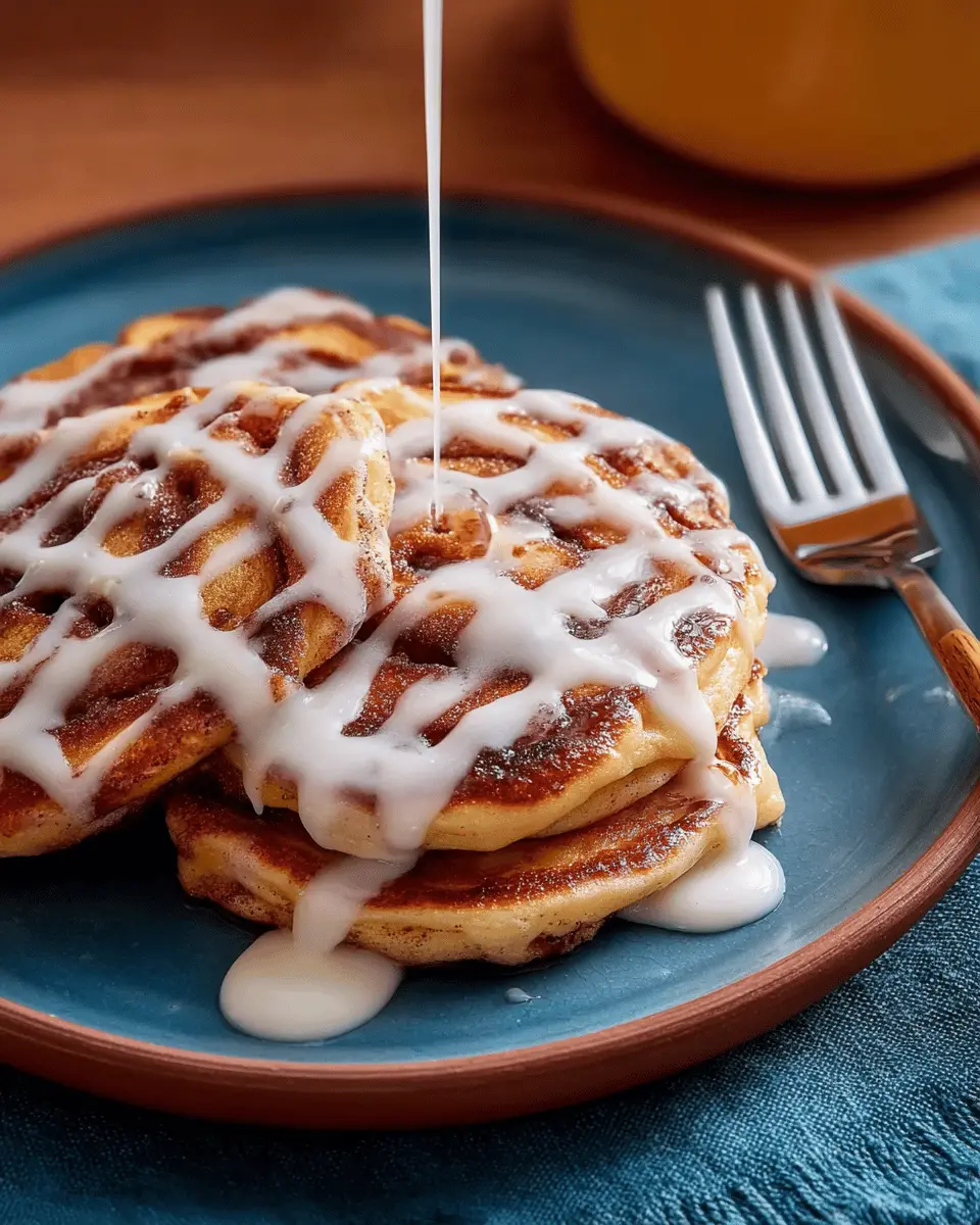 Presentation matters! Stack the cinnamon roll pancakes high on a vibrant plate, and drizzle the cream cheese icing in a zigzag pattern for visual appeal. Garnish with a sprinkle of powdered sugar and a few fresh berries on top. For a themed breakfast, serve on a rustic wooden board with small jars of syrup, fruit, and butter. These subtle touches can turn your brunch into an Instagram-worthy meal!