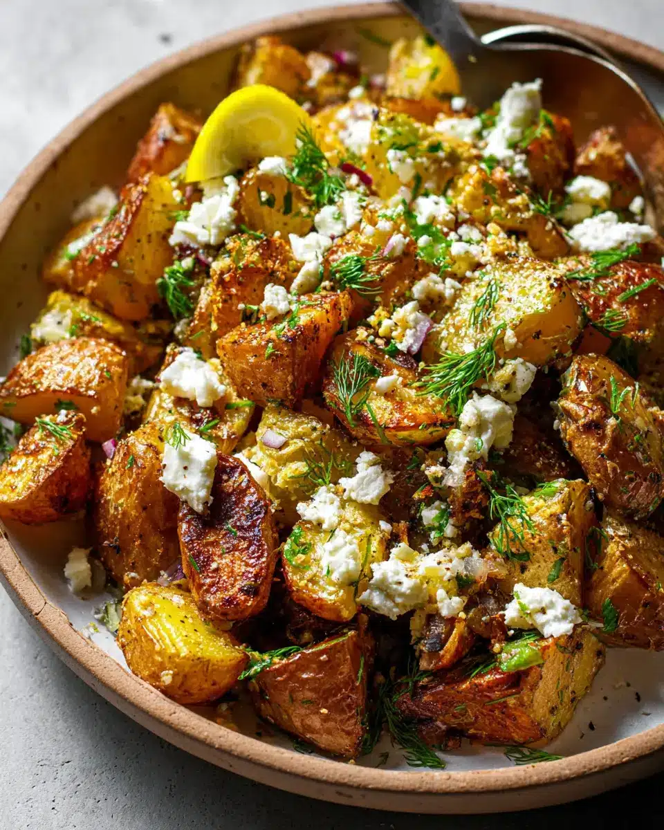 These crispy lemon-feta roasted potatoes make an excellent centerpiece for gatherings! Serve them in a large bowl lined with fresh dill for a pop of color, and let guests help themselves. You could also create a potato bar, inviting everyone to top their servings with various choices like crumbled chicken ham, olives, or even a sprinkle of smoked paprika. For a personal touch, serve them on individual plates with a dollop of tzatziki sauce, adding a fun, interactive element to your event.