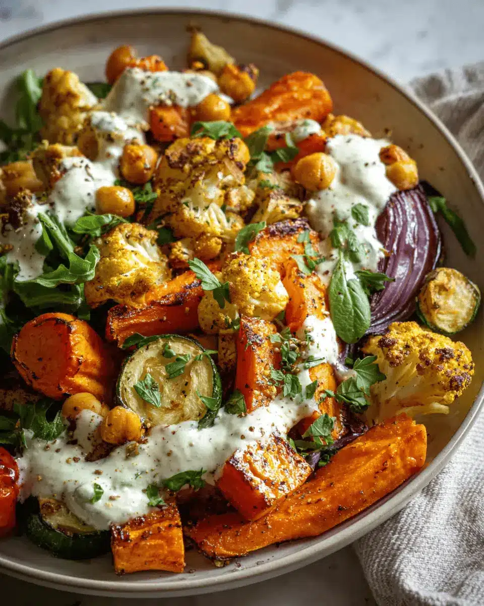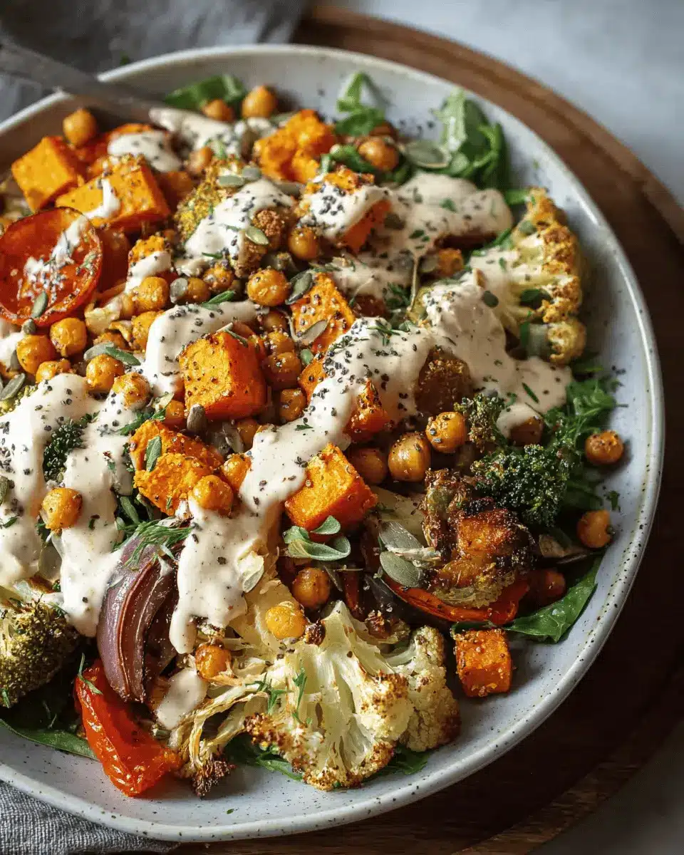 Now for the fun part! In a large bowl or plate, start with a bed of fresh arugula or greens of your choice. Next, layer on your beautiful roasted sweet potatoes, carrots, and cauliflower. Top it off with the crispy chickpeas, and don’t forget a generous drizzle of your tahini yogurt sauce. Feel free to sprinkle additional toppings like seeds, nuts, or more fresh herbs for that extra flair!