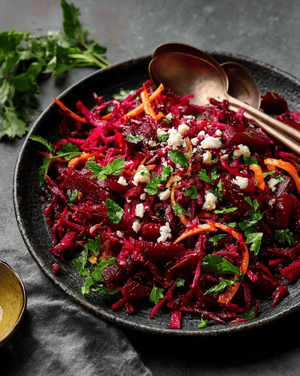 Finally, it’s time for the fun part: serving! Transfer your beautiful salad to a serving bowl. Top it with the remaining parsley and mint for a touch of elegance. If you want to elevate the presentation even further, consider adding a sprinkle of feta cheese or some crushed nuts. Not only do these add visual appeal, but they also complement the earthy flavors of the beets.