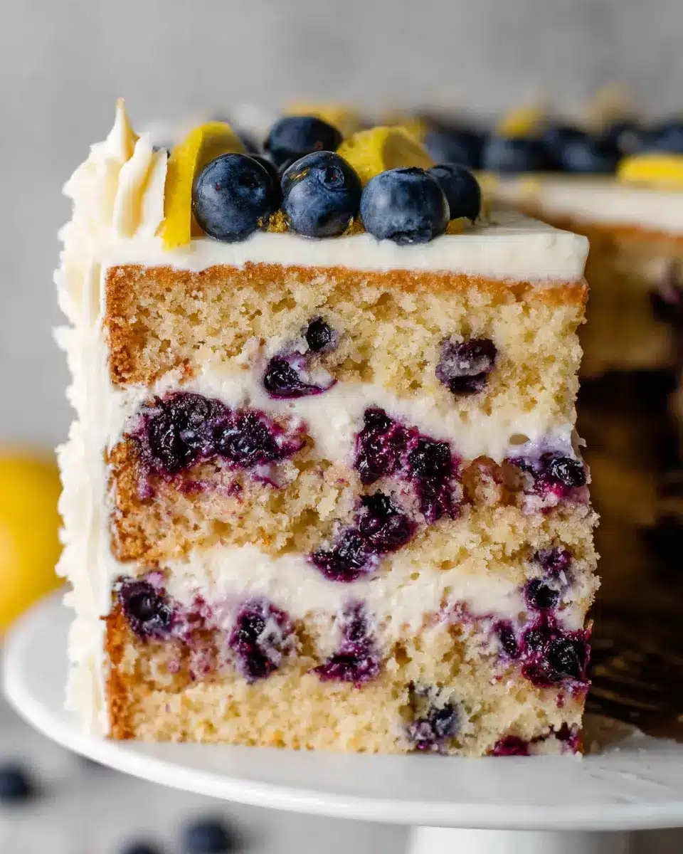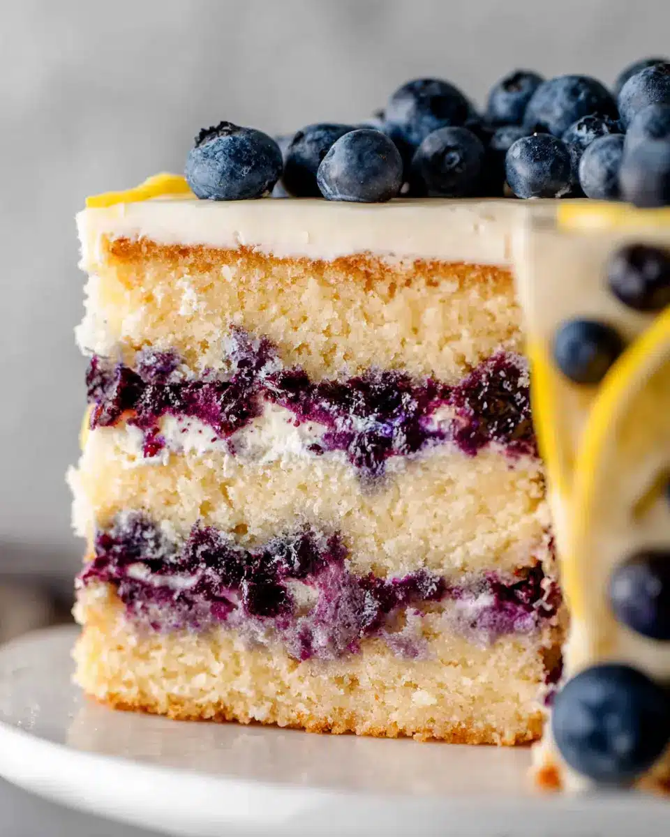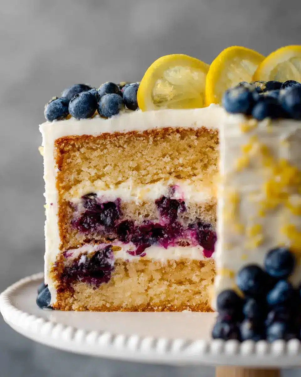 Decorate with fresh blueberries or lemon slices for that final touch. Let the cake chill for at least 45 minutes before slicing to ensure clean cuts.