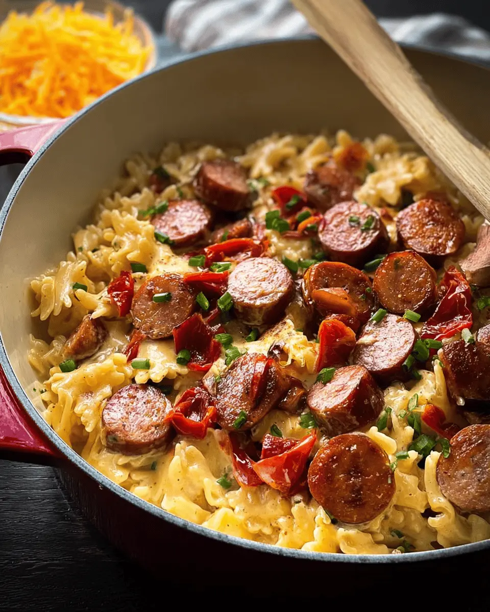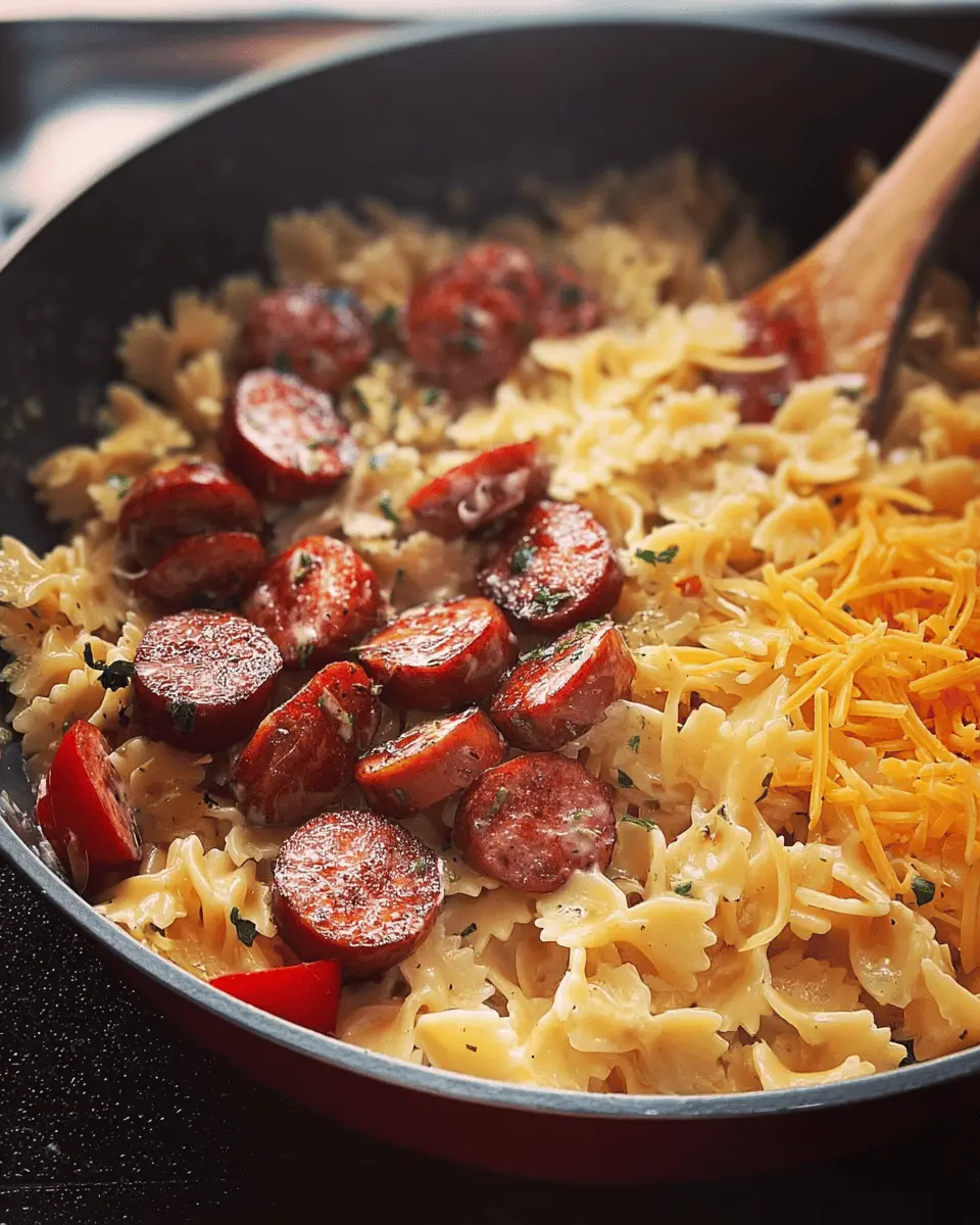 Once the pasta is fully cooked, it's time to bring back the star of the show—your crispy sausage! Add it back into the skillet along with 2 cups of shredded cheddar cheese. Stir everything together until the cheese is melted and beautifully combined with the pasta and sausage. You've just created a creamy masterpiece that’s sure to impress anyone at your dinner table.