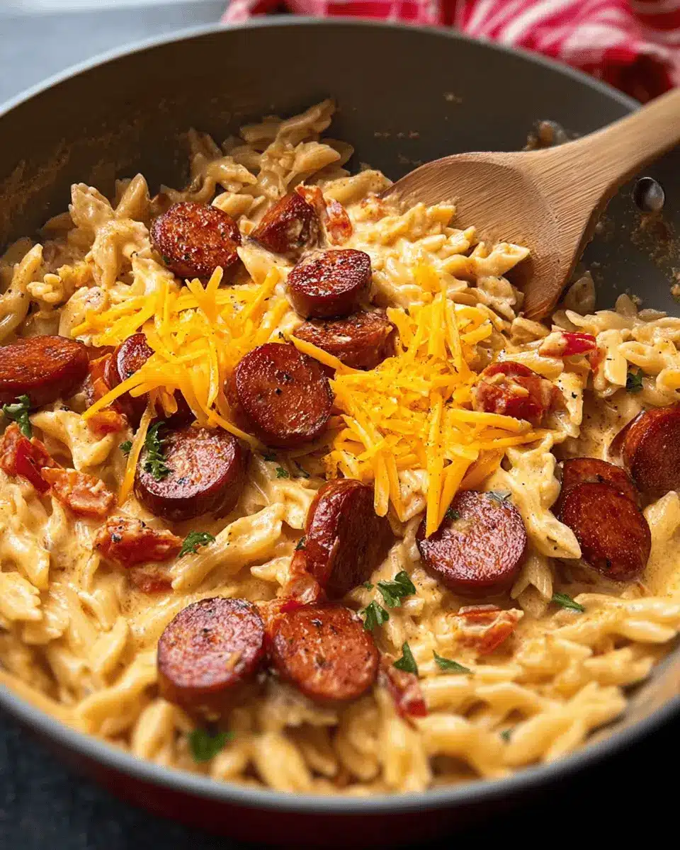 This creamy pasta recipe is highly adaptable to suit even the pickiest eaters—substitute ingredients such as using turkey bacon instead of sausage, or add some veggies like spinach for a nutrient boost. By using versatile options, you can ensure everyone at your table leaves happy. If you want to elevate your weeknight dinners, bookmark this recipe for your next meal plan!