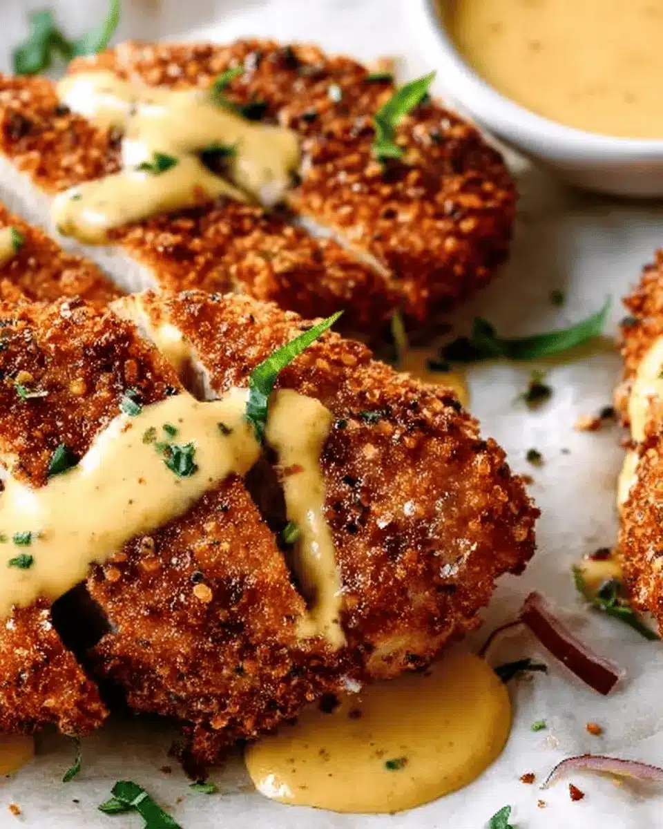 If you’re lucky enough to have some leftovers, store them in an airtight container in the refrigerator for up to three days. When reheating, pop the chicken in a 350°F oven for about 20 minutes, or try an air fryer for that satisfying crunch again. Keep the cheddar-mustard sauce stored separately, and reheat gently to maintain its creamy texture—nobody likes clumpy sauce!
