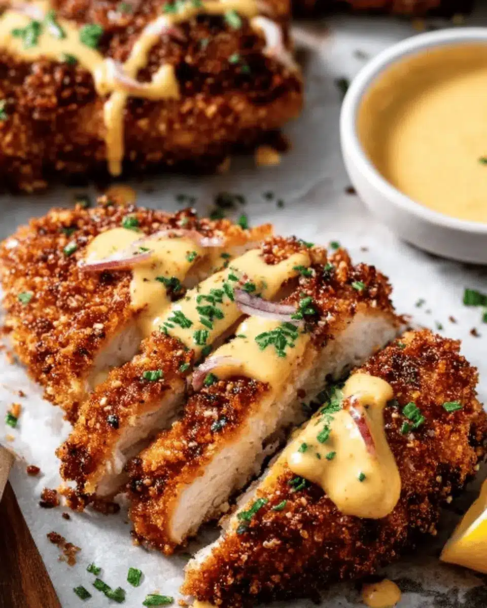 Feeling adventurous? Try a tortilla chip crusted alternative for a fun crunch! Simply crush up your favorite tortilla chips and follow the same breading process. This variation adds a different texture and flavor that pairs marvelously with the cheddar-mustard sauce.