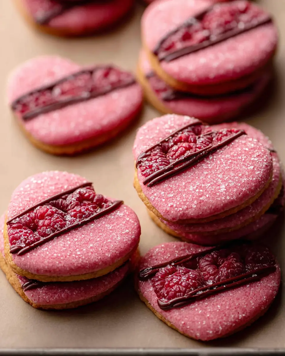 Finally, let’s give these cookies a touch of elegance! Melt 4 ounces of semi-sweet or white chocolate using a double boiler or a microwave. Dip half of each cooled cookie into the chocolate, or drizzle it on top for a chic finish. To add some flair, sprinkle with extra raspberry powder or colored sprinkles before the chocolate sets.