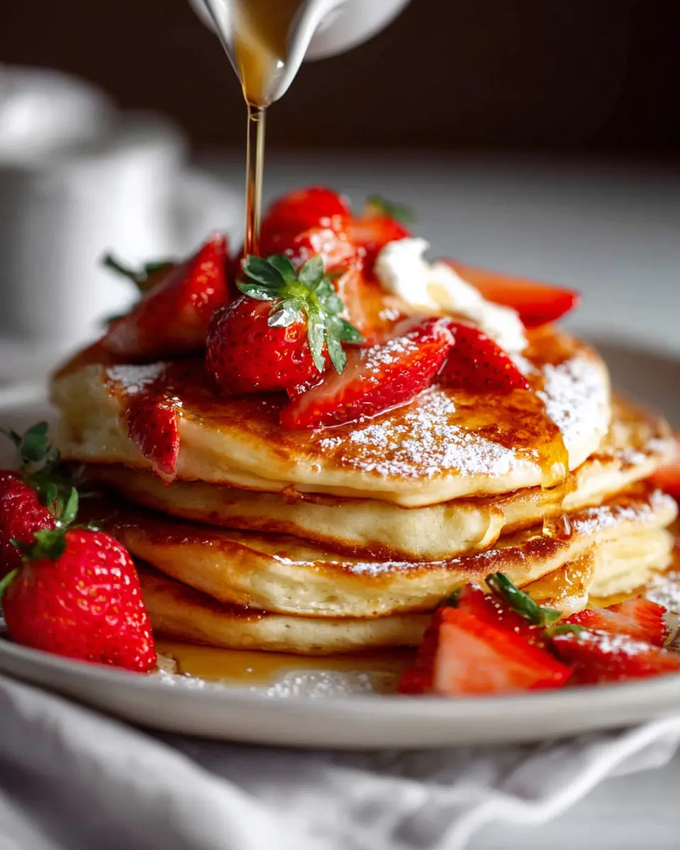- Serve pancakes with strawberries, softened butter, and generous maple syrup.