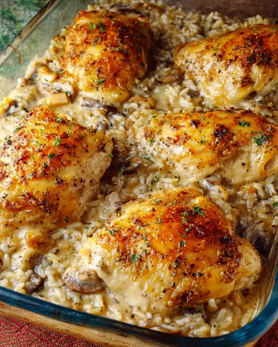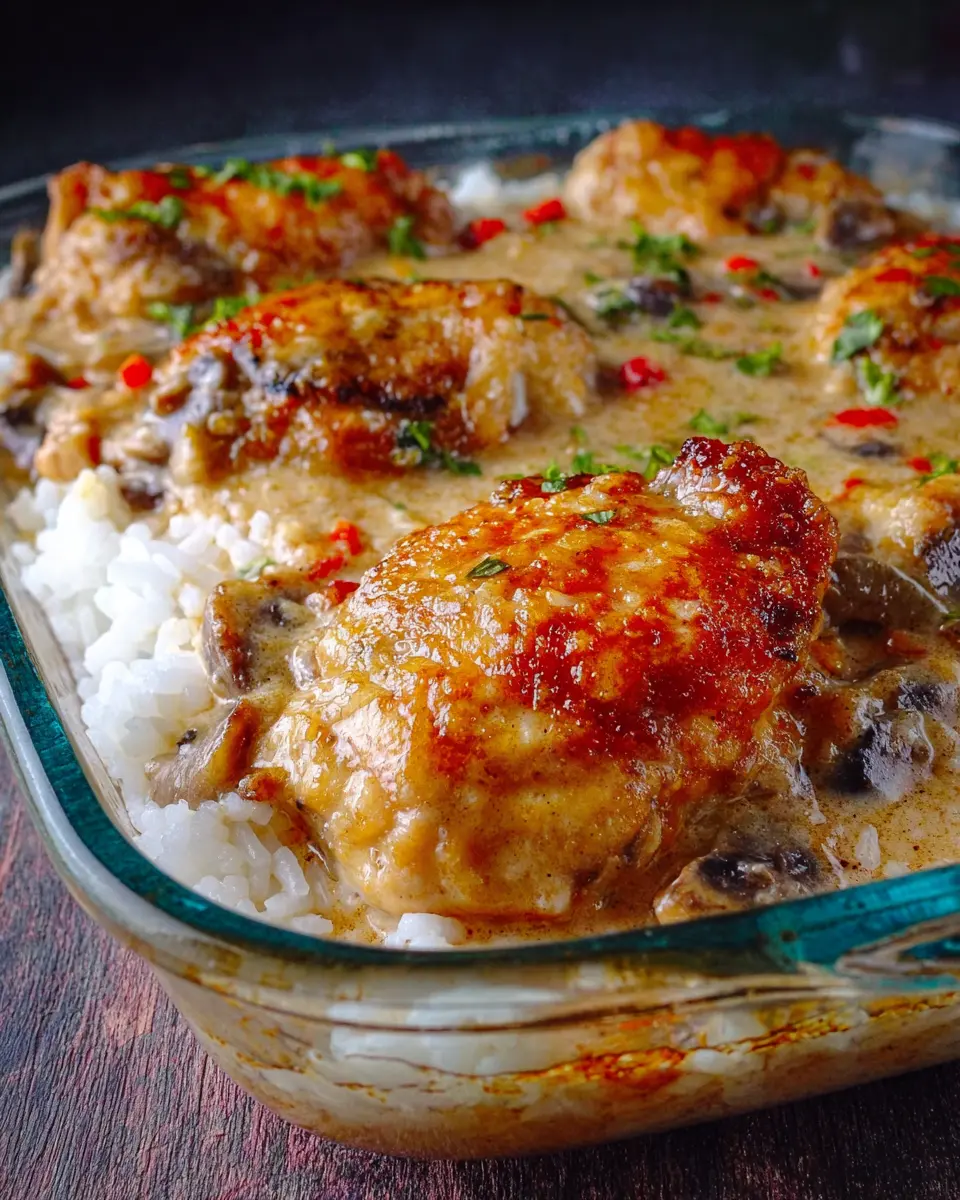 Place your beautifully browned chicken on top of the rice. And finally, pour that luscious mushroom soup mixture all over the chicken, ensuring every piece gets a bit of that creamy goodness.