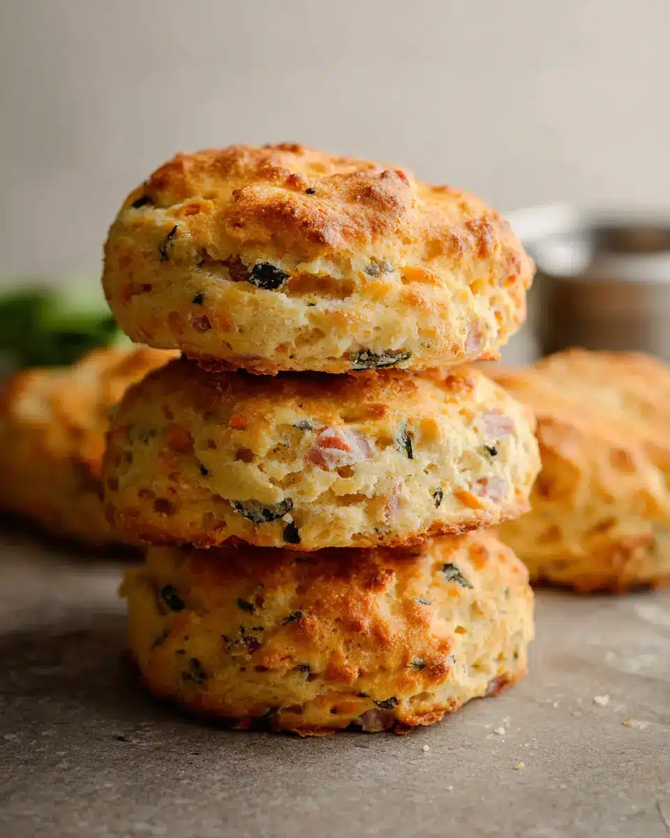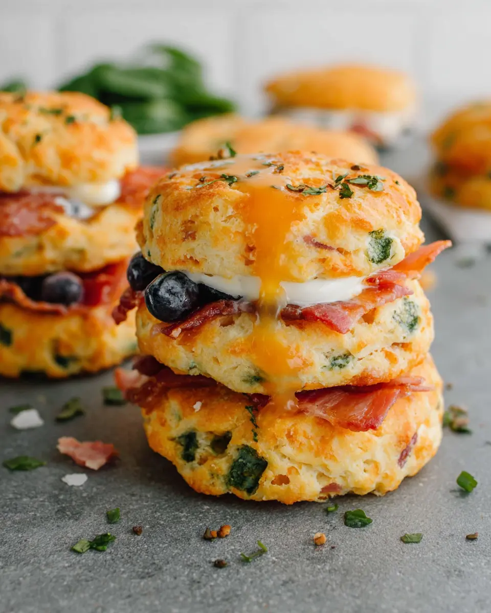For a classic twist, try the Ham, Cheese & Chive variation of these breakfast protein biscuits. Simply fold in 2 cups of diced chicken ham, 1.5 cups of shredded cheddar cheese, and a generous ½ cup of finely diced chives into your dough. Toss in some chopped spinach for extra nutrients. This savory combination is perfect for your busy mornings, delivering flavor and protein in every bite.